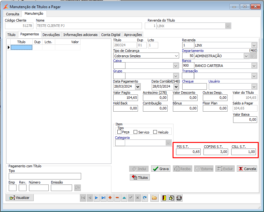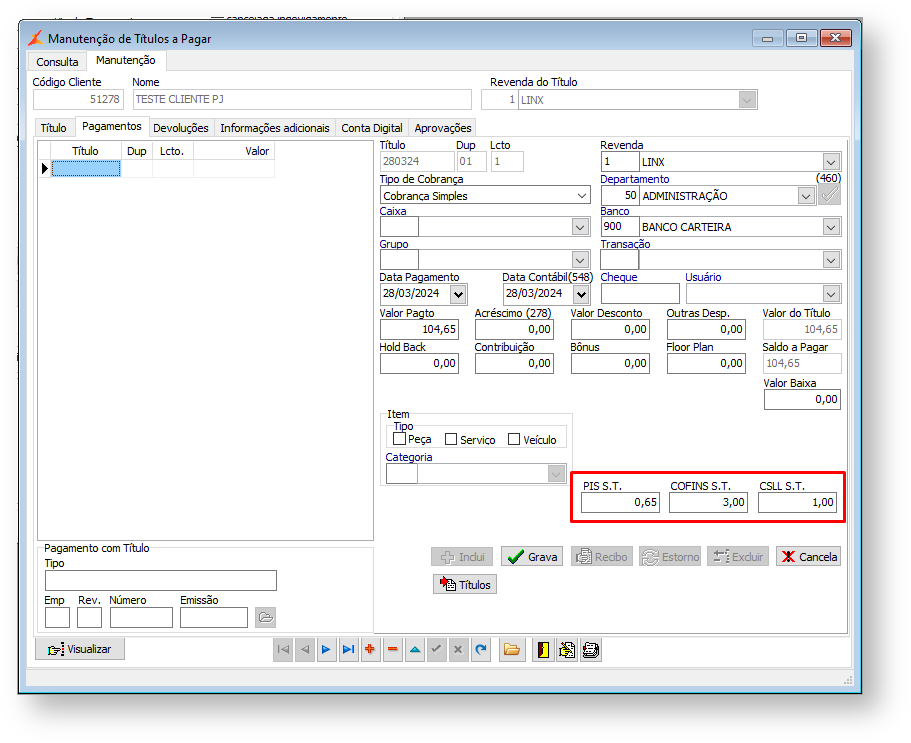 Esta configuração permite que ao dar entrada em notas de fornecedores, ao criar o título a pagar dessa nota, os Impostos PIS, COFINS e CSLL sejam automaticamente informados na criação e no pagamento do título.
