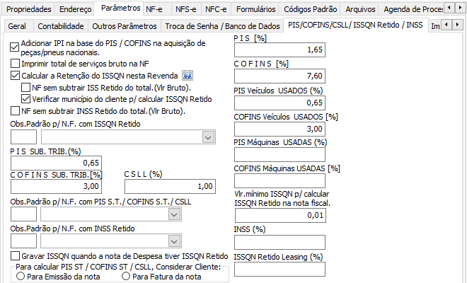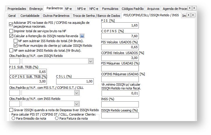 2.3 - Na aba “PIS/COFINS/CSLL/ISSQN Retido/INSS”, deve-se escolher a porcentagem dos impostos que irá utilizar.