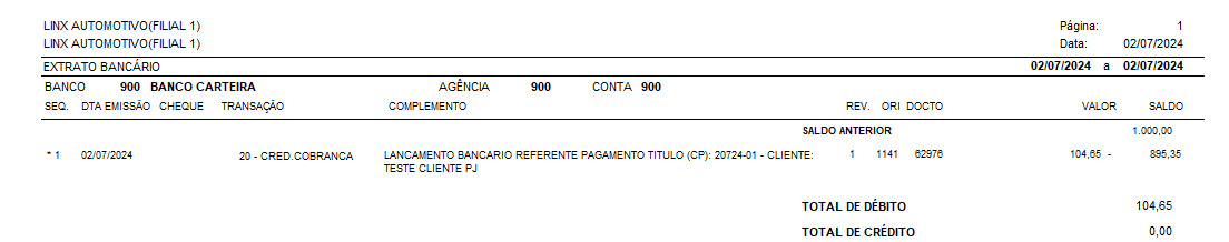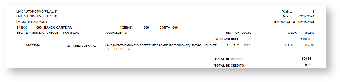 6 - Agora podemos verificar como ficou o lançamento no banco que esse titulo foi baixado, pelo MENU: FINANCEIRO - CAIXA E BANCOS - EXTRATO BANCÁRIO.