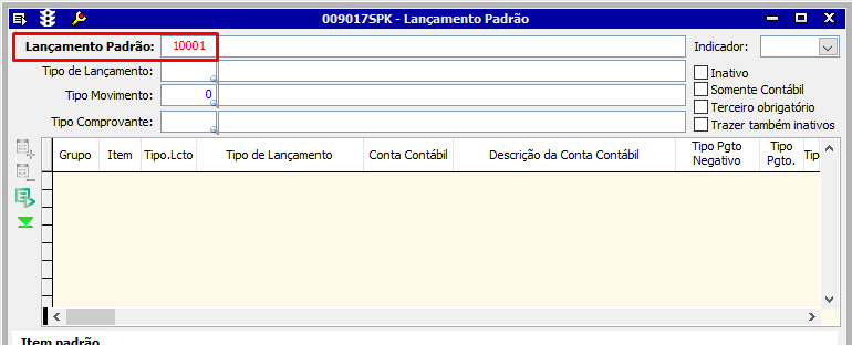 2. No caminho Módulo de Contabilidade > Tela 009017 - Lançamento Padrão, pesquise pelo lançamento padrão localizado no passo anterior: