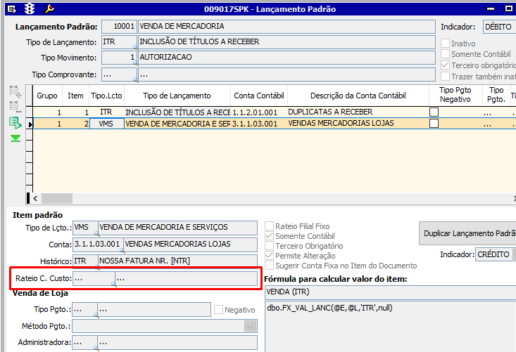 3. Localize o tipo de lançamento que possui o campo Rateio C. Custo em branco: