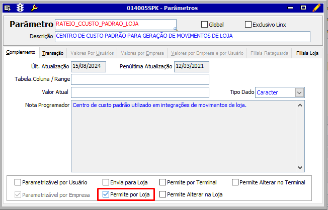 7. Pesquise pelo parâmetro RATEIO_CCUSTO_PADRAO_LOJA;
