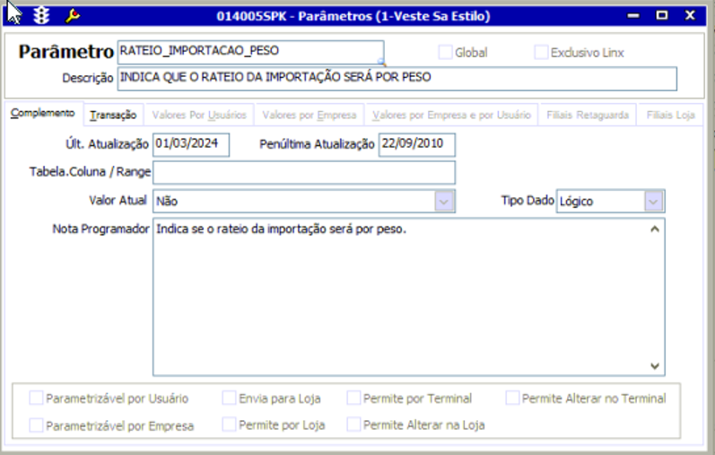 - Pesquise pelo parâmetro RATEIO_IMPORTACAO_PESO;