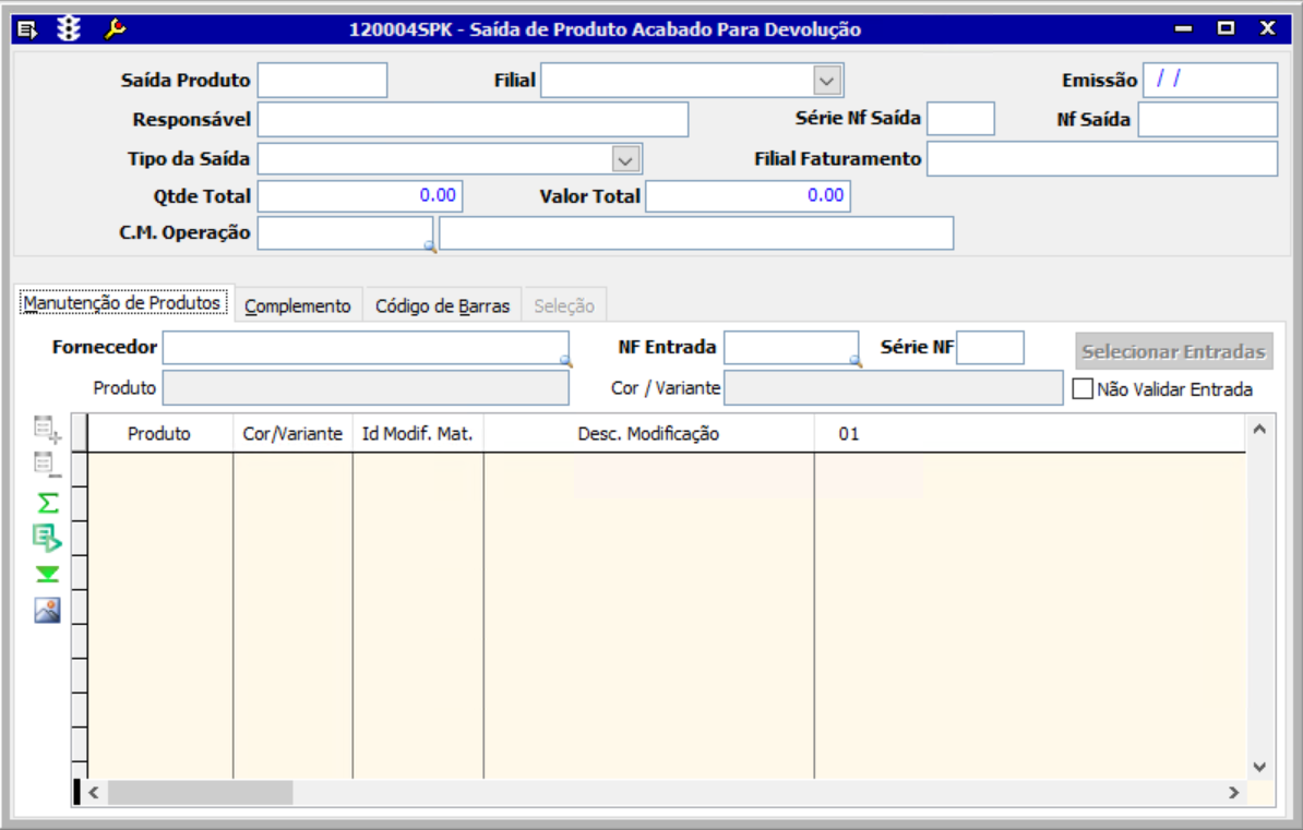 - Acesse a tela 120004 - Saída de Produto Acabado para Devolução;