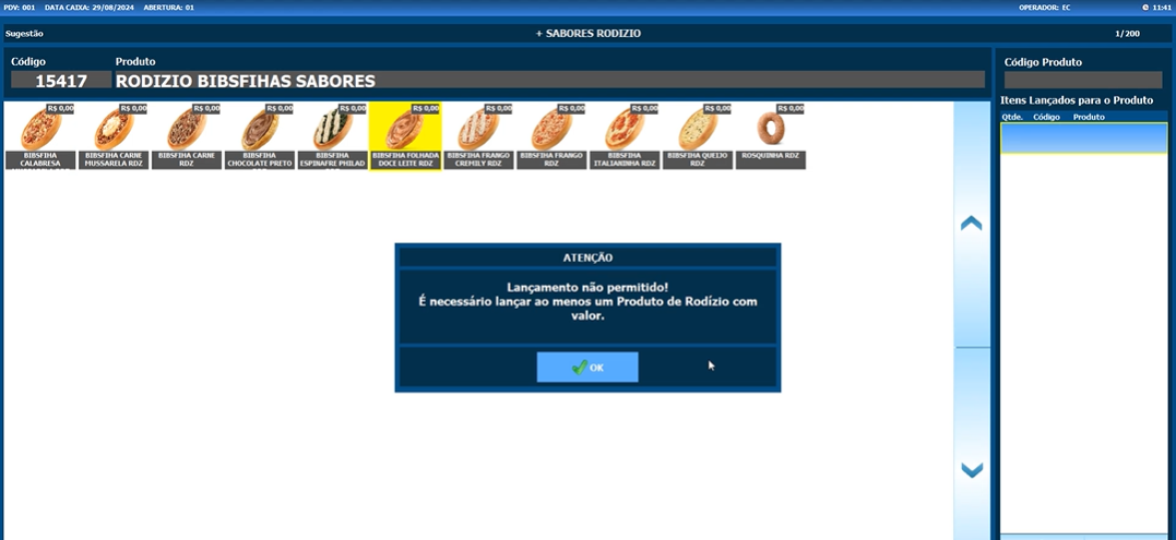 "Lançamento não permitido! É necessário lançar ao menos um produto Rodízio com valor."