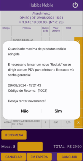 "Quantidade máxima de produtos rodízio atingida! Vá até o PDV para efetuar a liberação via senha gerencial."