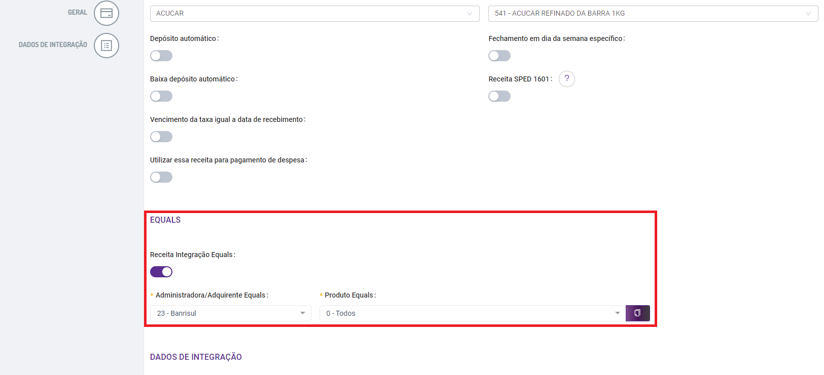 Será necessário habilitar a flag "Receita integração Equals" e preencher os campos: "Administradora/ Adquirente Equals" e Produto Equals".