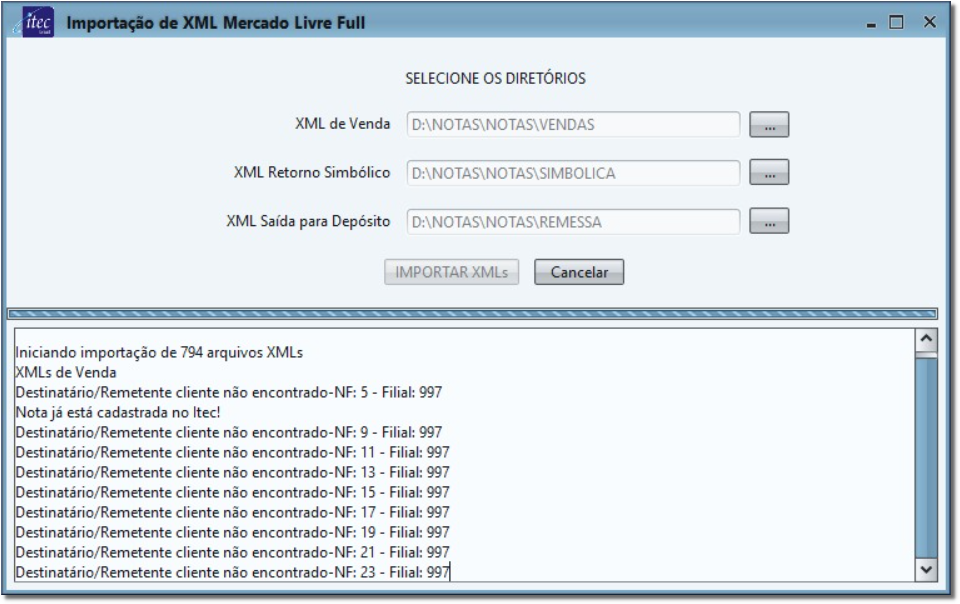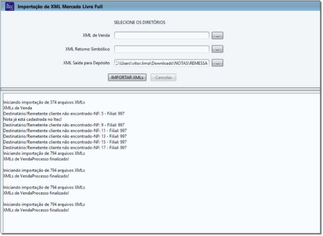 5. Após a finalização da importação dos documentos fiscais emitidos pela plataforma do Mercado Livre, serão apresentadas as seguintes mensagens para os XML de Venda, XML Retorno Simbólico e XML de Saída para Deposito: