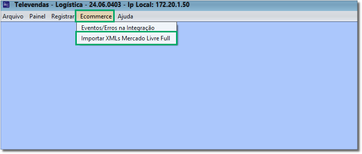 1. Para realizar a importação do XML do Mercado Livre, acesse: Módulo Televendas - Logística > menu E-commerce > Importar XMLs Mercado Livre Full