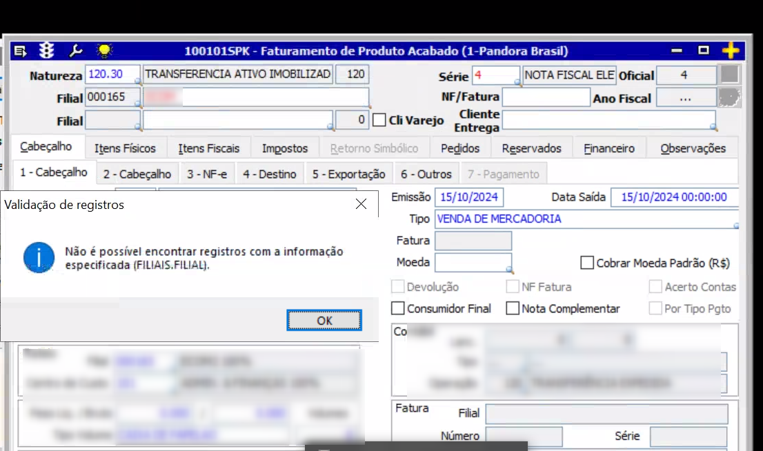 Descrição: Ao digitar a filial no campo Filial a mensagem de alerta ocorre "Não é possivel encontrar registros com a informação especificada (FILIAIS.FILIAL)"