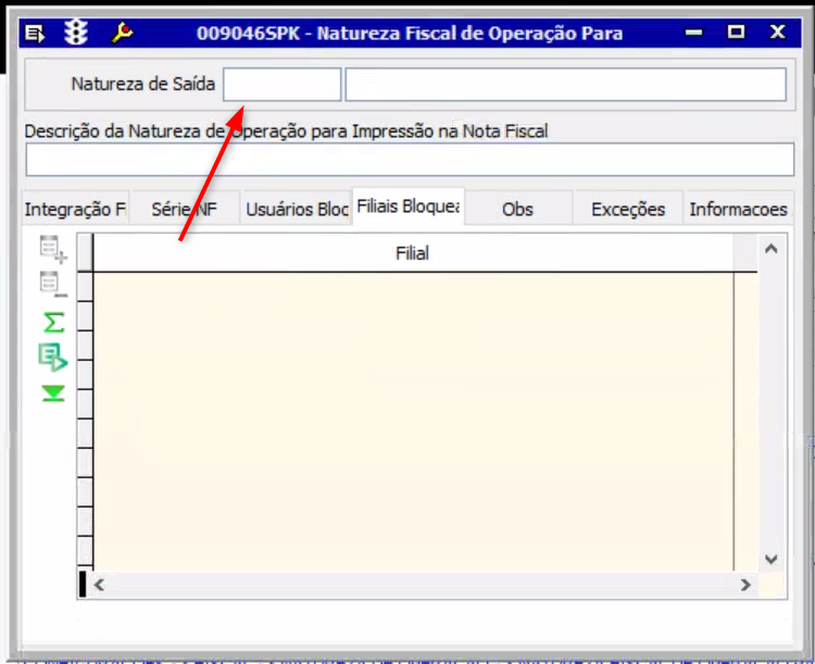 - Acesse a tela [009046SPK] que se localiza no caminho LIVROS FISCAIS -> TABELA DE APOIO -> NATUREZA DE OPERAÇÃO -> NATUREZA FISCAL DE OPERAÇÃO PARA SAÍDA [009046SPK];