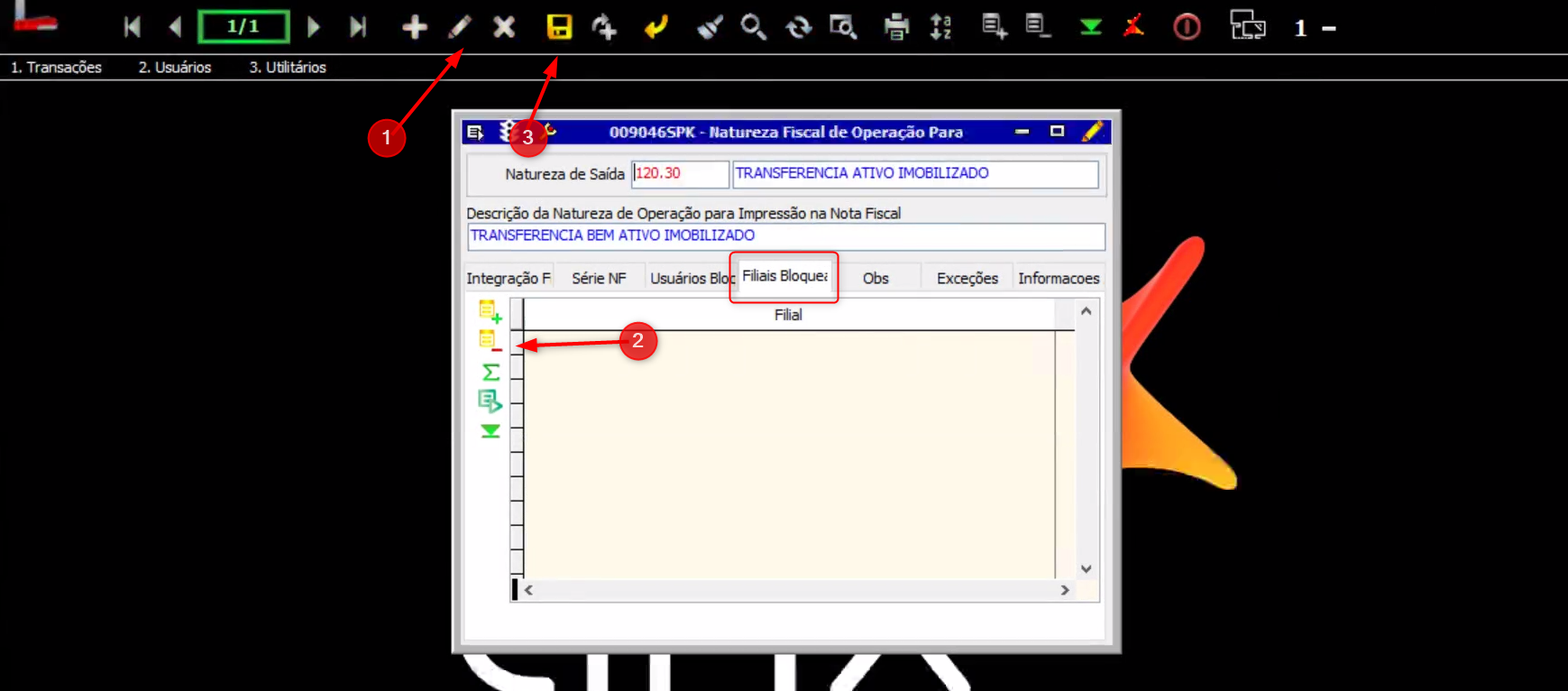 - Acesse a aba de Filiais Bloqueadas e caso a filial que esteja apresentando o alerta informado anteriormente estiver selecionada, clique em editar e exclua:
