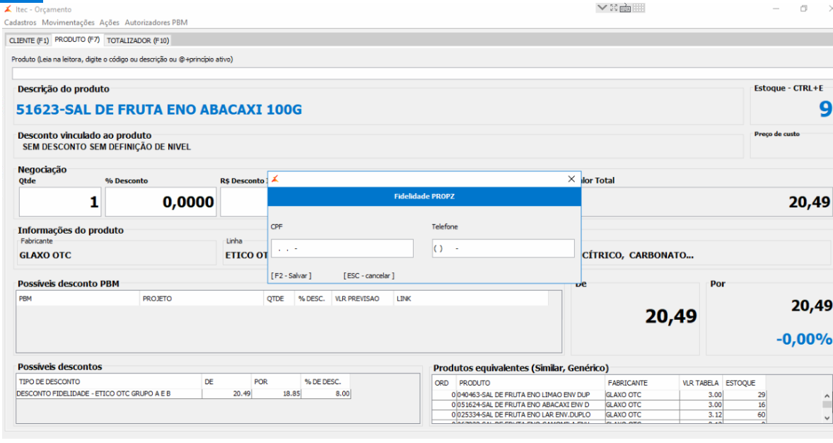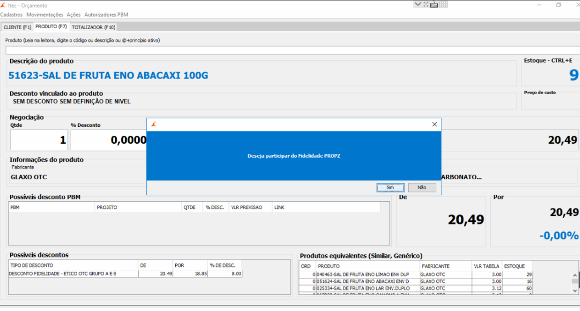 2. Ao inserir um produto pertencente a uma tabela de descontos identificada como "Enviar para a Propz", será gerado uma mensagem de "Deseja participar do Fidelidade Propz?".