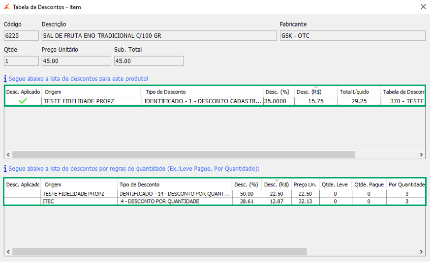 9. Clique em Exibir Descontos para abrir a Tabela de Descontos - Item onde é possível visualizar a lista de descontos para este produto ou a lista de descontos por regras de quantidade.