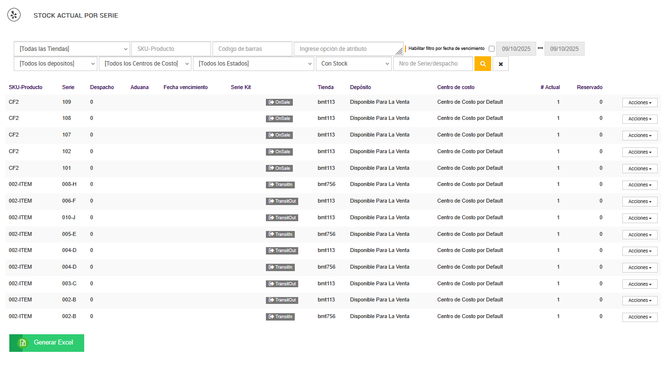 - Generar Excel: Exporta la información de stock actual por serie en un archivo Excel, facilitando el análisis externo.