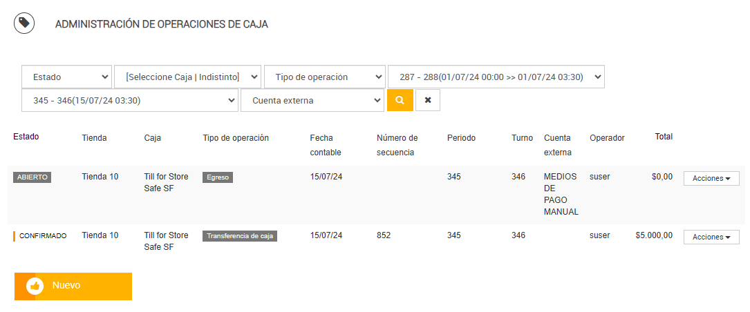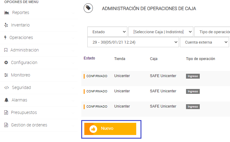 - Para generar una nueva operación presionar el botón "Nuevo" del listado de "Administración de operaciones de caja"