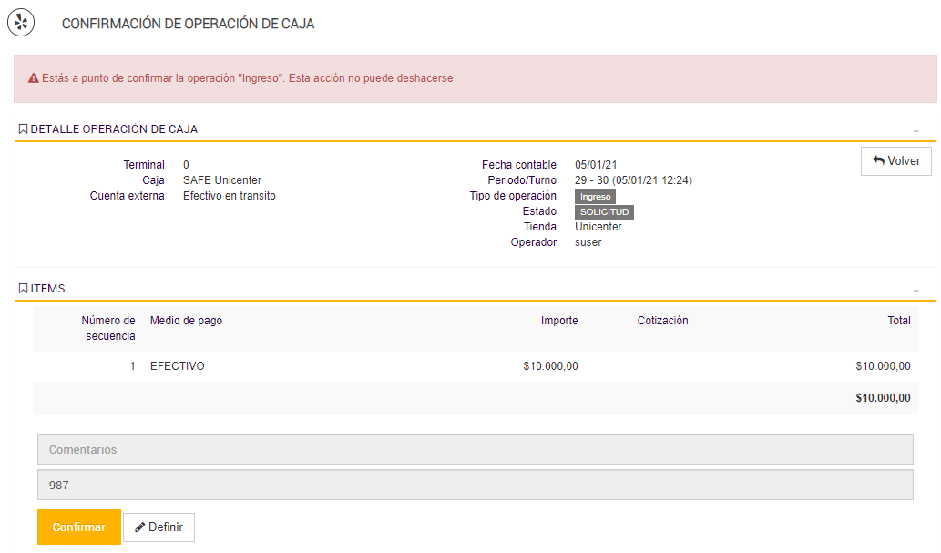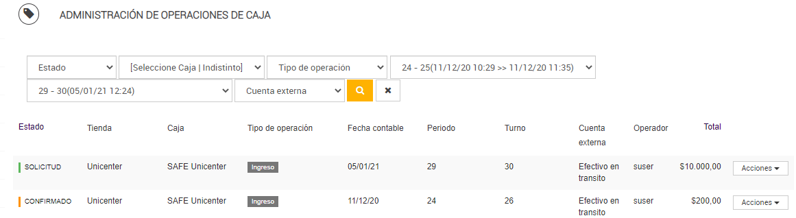 - Al confirmar pasa al listado de "Administración de operaciones de caja" con el estado según la cuenta contable que se haya utilizado.