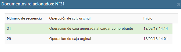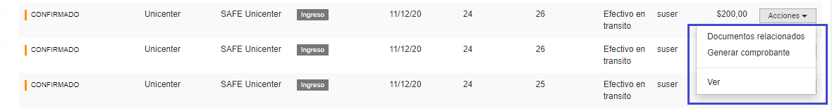 Documentos Relacionados: Permite acceder a documentos relacionados con la operación de caja, proporcionando una vista más completa de las transacciones vinculadas. Esta acción está disponible solo para operaciones de caja en estado "Confirmado".