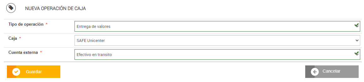 Tipo de Operación/Campos requeridos | Caja/SAFE | Cuenta Externa | Caja Destino | Portavalores |