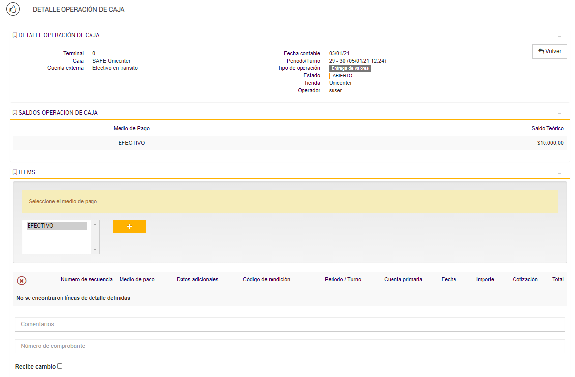 - A excepción de los ingresos, el resto de las operaciones requerirá contar con saldo del medio de pago seleccionado. Esta información desglosada por medio de pago es la informada como "Saldos de operación de caja" con la columna "Saldo teórico"