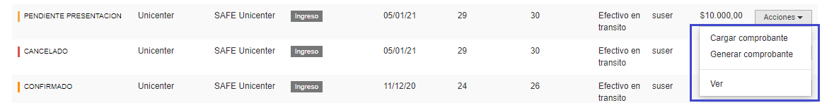 - Dentro de las acciones tendrá: "Cargar comprobante", "Generar comprobante" o "Ver"