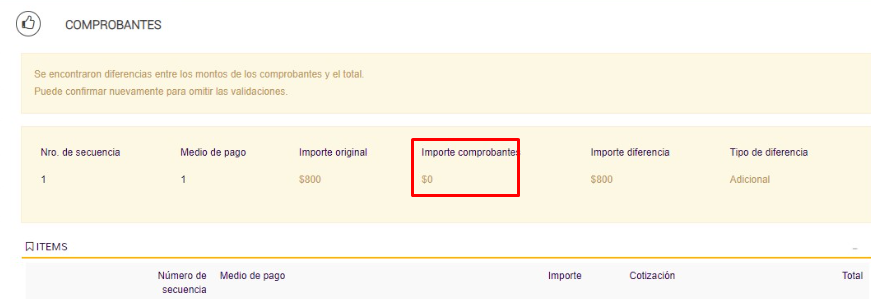 En caso de no asignar valores a los ítems, existirán diferencias entre el valor del Importe Original y el Importe Comprobante
