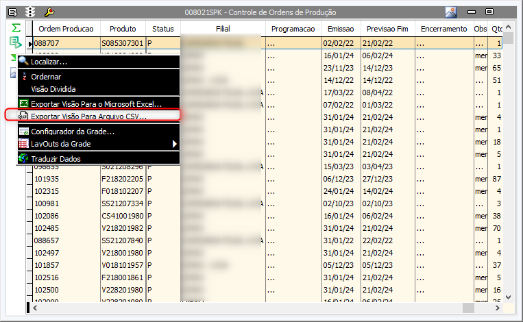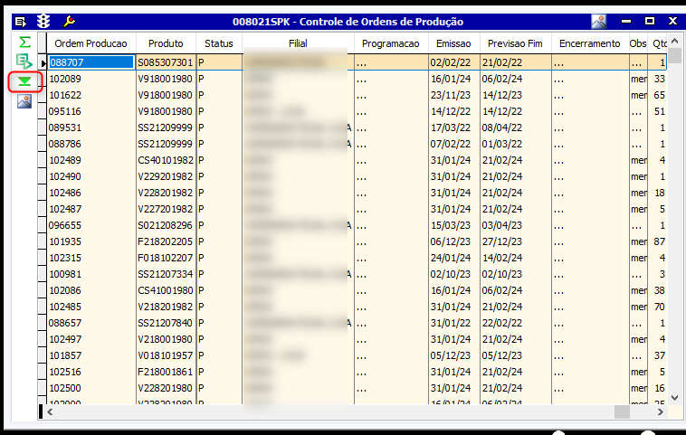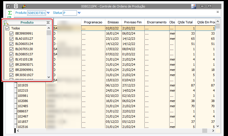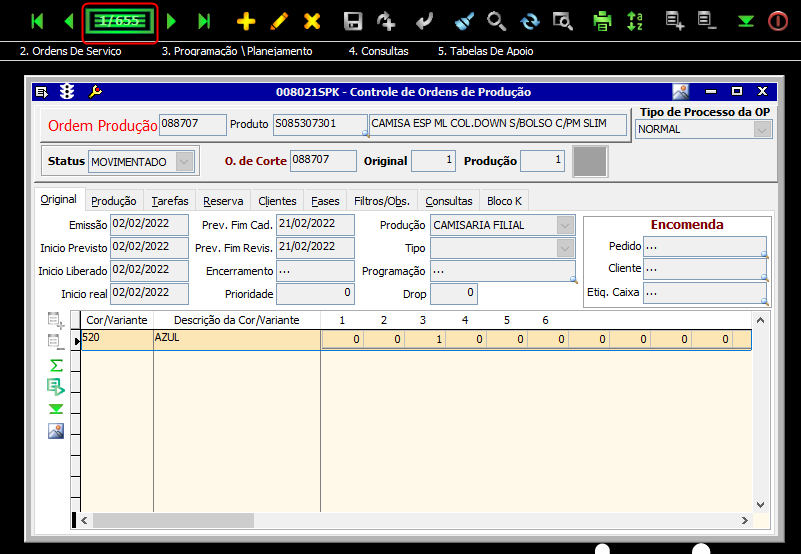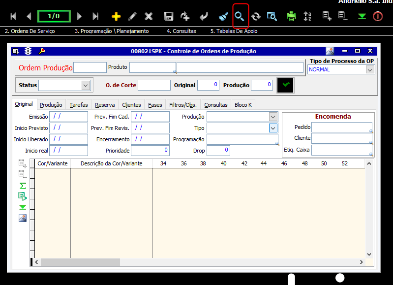 - Acesse a tela 008021 através do caminho Producao > Ordens > Controle Controle de Ordens de Produção;