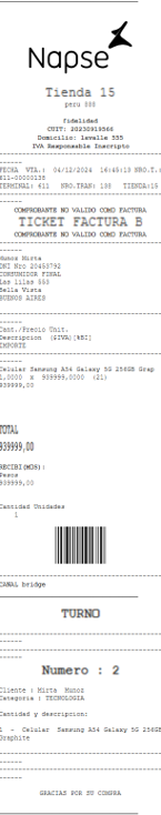 • Al finalizar la transacción, el sistema imprime los turnos correspondientes en el ticket del cliente: