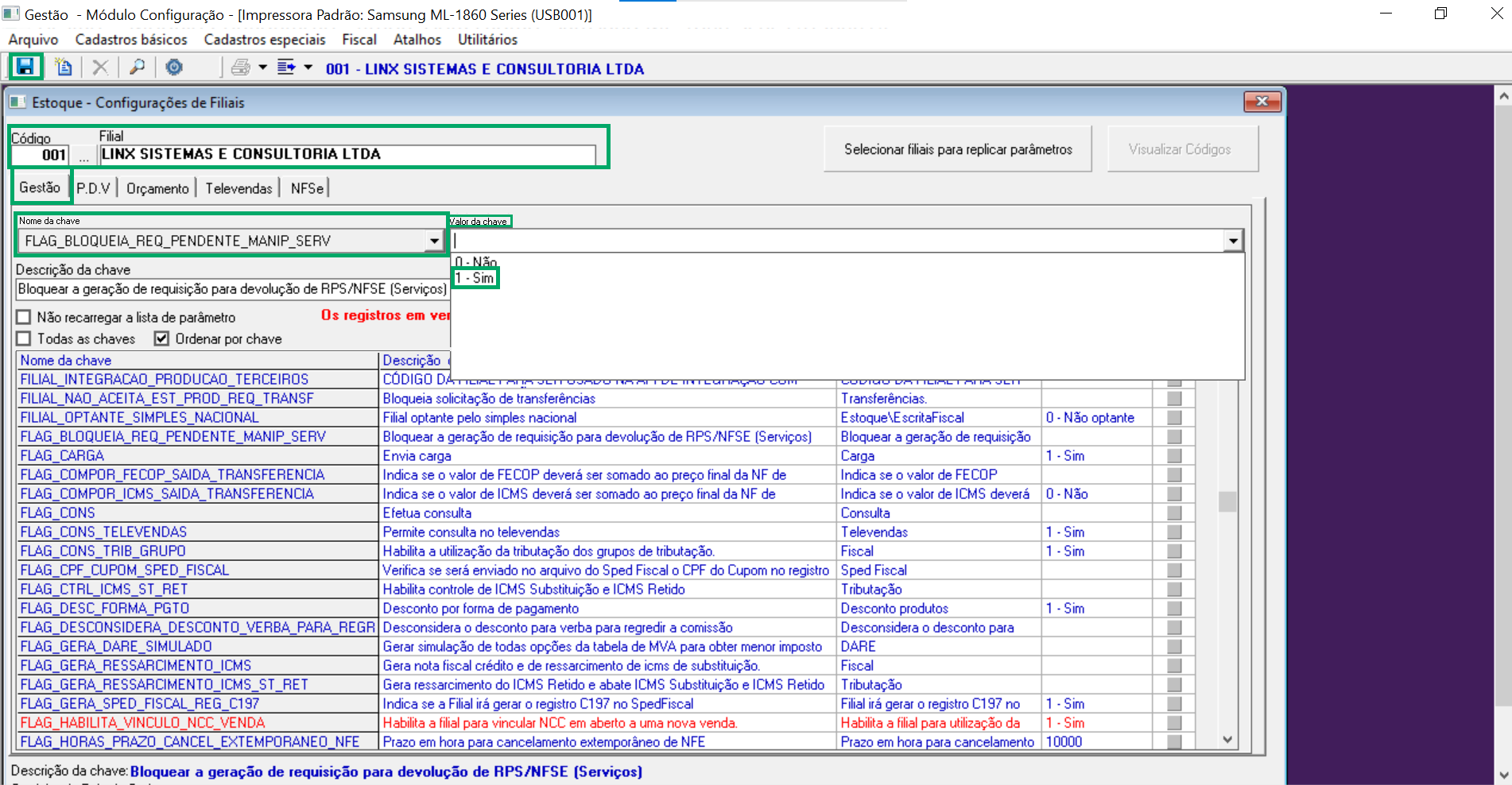 3. Na aba Gestão, vá até o campo Nome da chave e selecione o campo FLAG_BLOQUEIA_REQ_PENDENTE_MANIP_SERV.