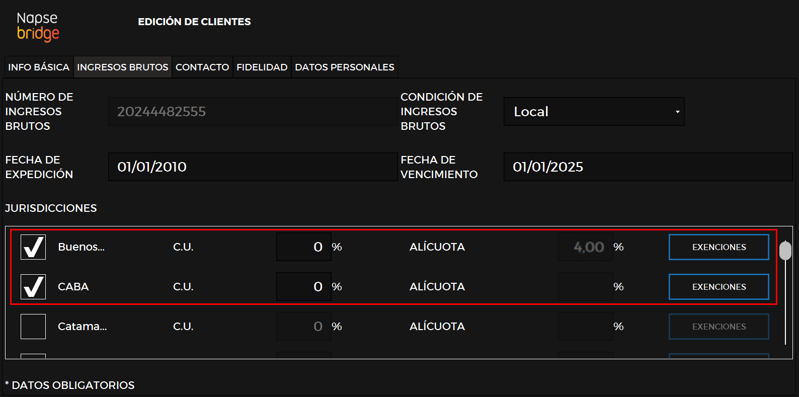 Esta sección aborda la configuración y gestión de clientes con condiciones impositivas específicas, como exentos o de régimen simplificado de Ingresos Brutos (IIBB), en el sistema Bridge.