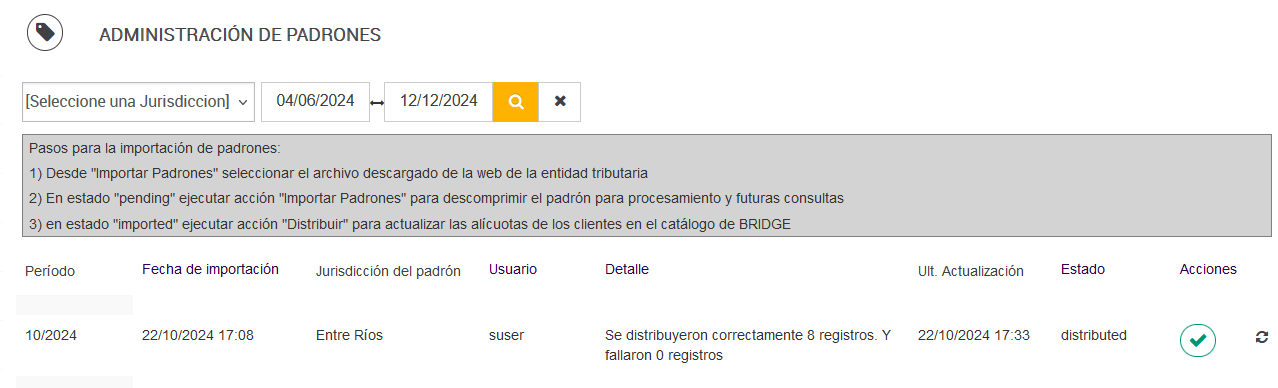 • El operador deberá presionar la flechita amarilla en la columna Acciones para que se actualicen las alícuotas de los clientes de Bridge en base al padrón