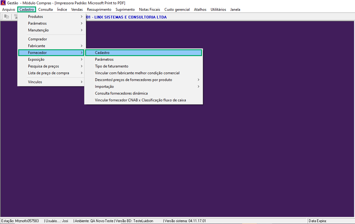 1. Para realizar o cadastro do fornecedor utilizando a integração Neogrid, acesse: Módulo Compras > menu Cadastro > opção Fornecedor > e clique em Cadastro