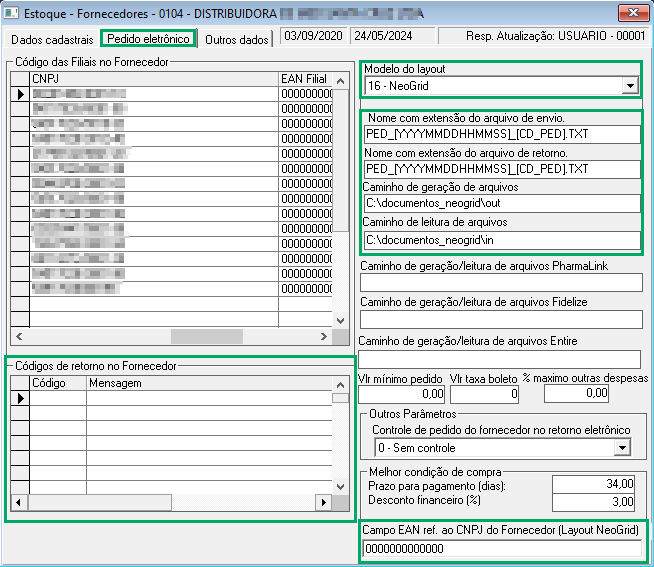 6. No campo Campo EAN referente ao CNPJ do Fornecedor (Layout NeoGrid) informe EAN referente ao CNPJ das filiais e do Fornecedor.