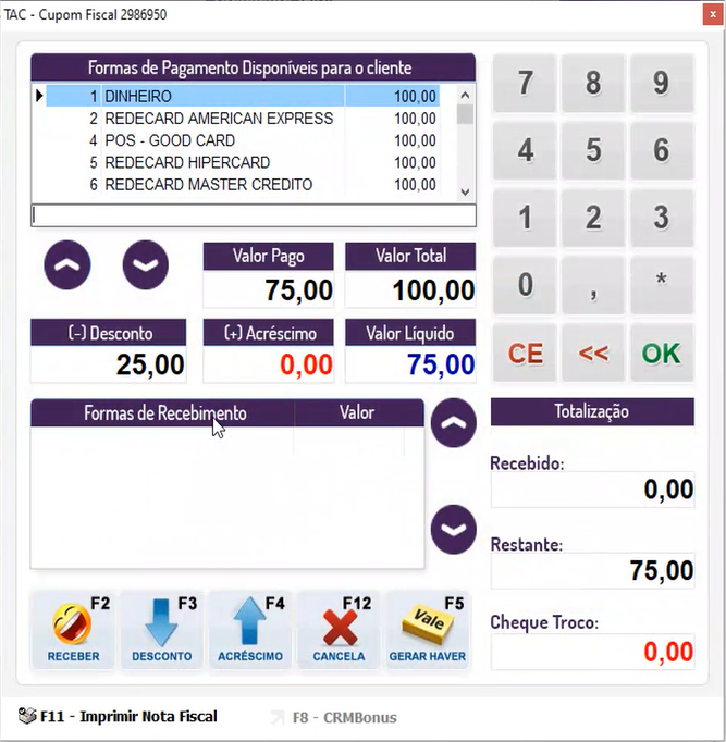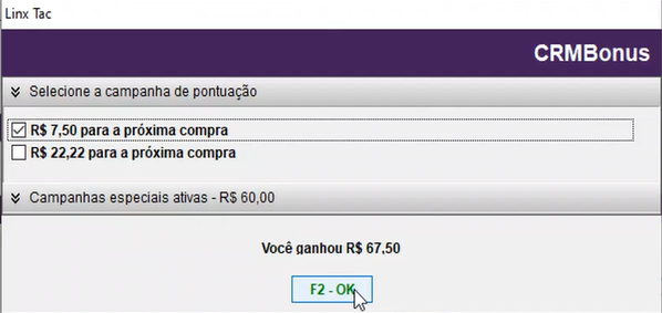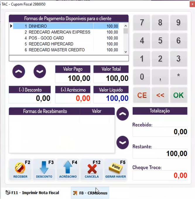 Com o processo de venda em andamento, ao chegar à tela de formas de pagamento, onde será exibido um novo botão F8- CRMBonus.