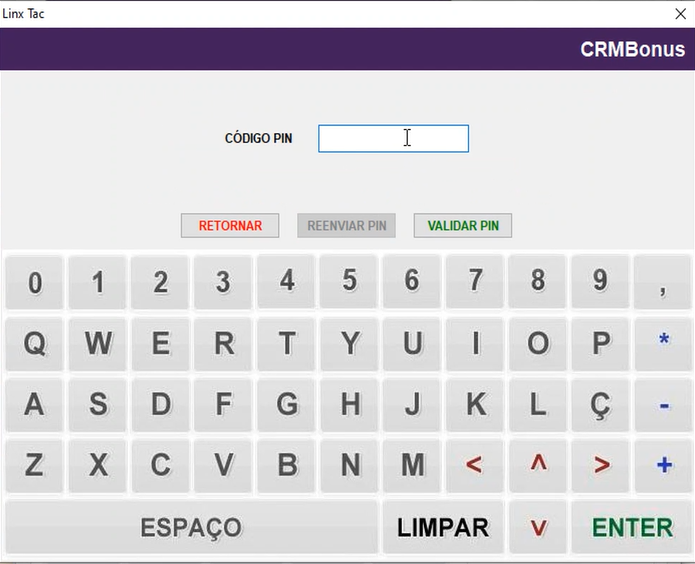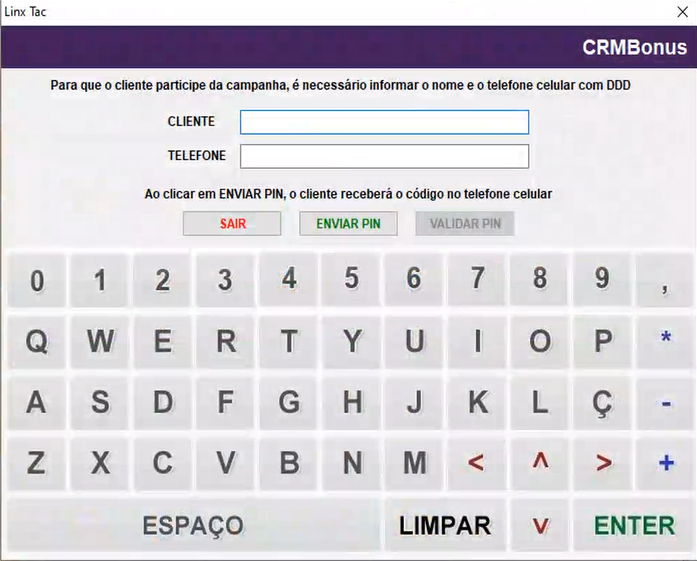 Ao clicar no botão “F8 - CRMBonus”, uma nova tela será exibida, solicitando o preenchimento dos dados do cliente (cliente e telefone). Após preencher as informações, clique no botão envio do ENVIAR PIN.