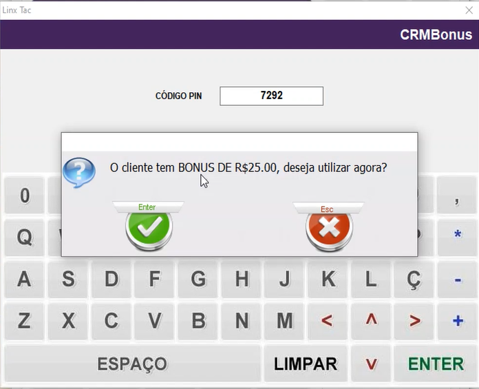 Ao realizar a validação do PIN, o TAC consulta as campanhas disponíveis para o cliente no CRMBonus. Caso o cliente possua alguma campanha ativa, será exibida uma mensagem informando o valor do desconto então poderá decidir se deseja utilizar o desconto na venda ou não.