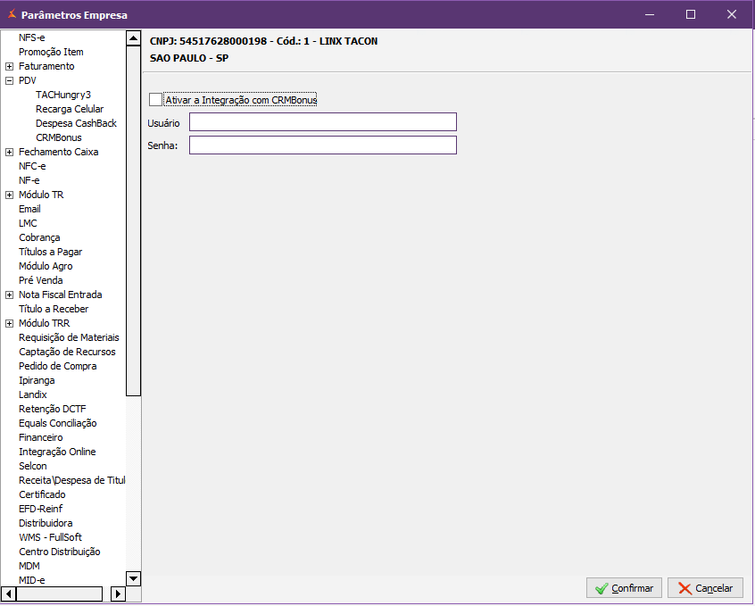 Para configurar o CRM Bônus no sistema, acesse: EMSys3 → Sistema → Parâmetros Empresa → PDV → CRMBonus.