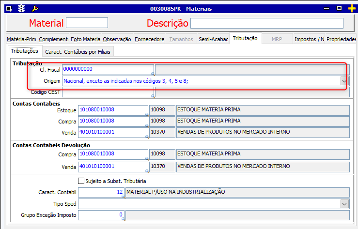 - Acesse a tela 003008spk através do caminho Material > Matérias Primas > Materiais;