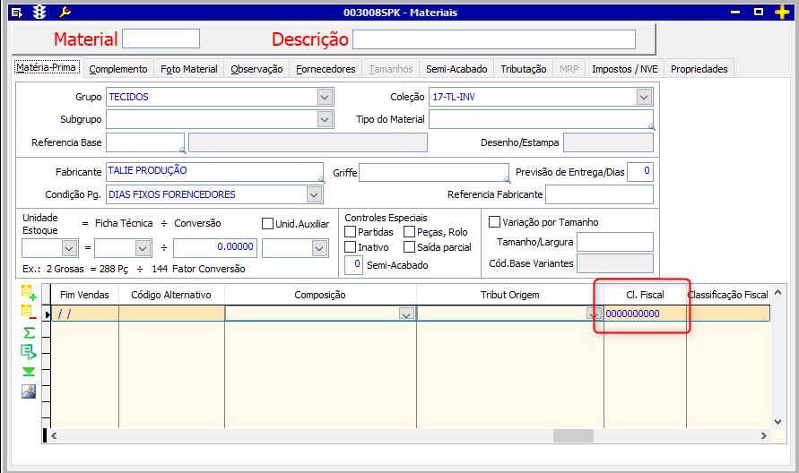 - Clique na aba MATÉRIA-PRIMA e altere a classificação fiscal;