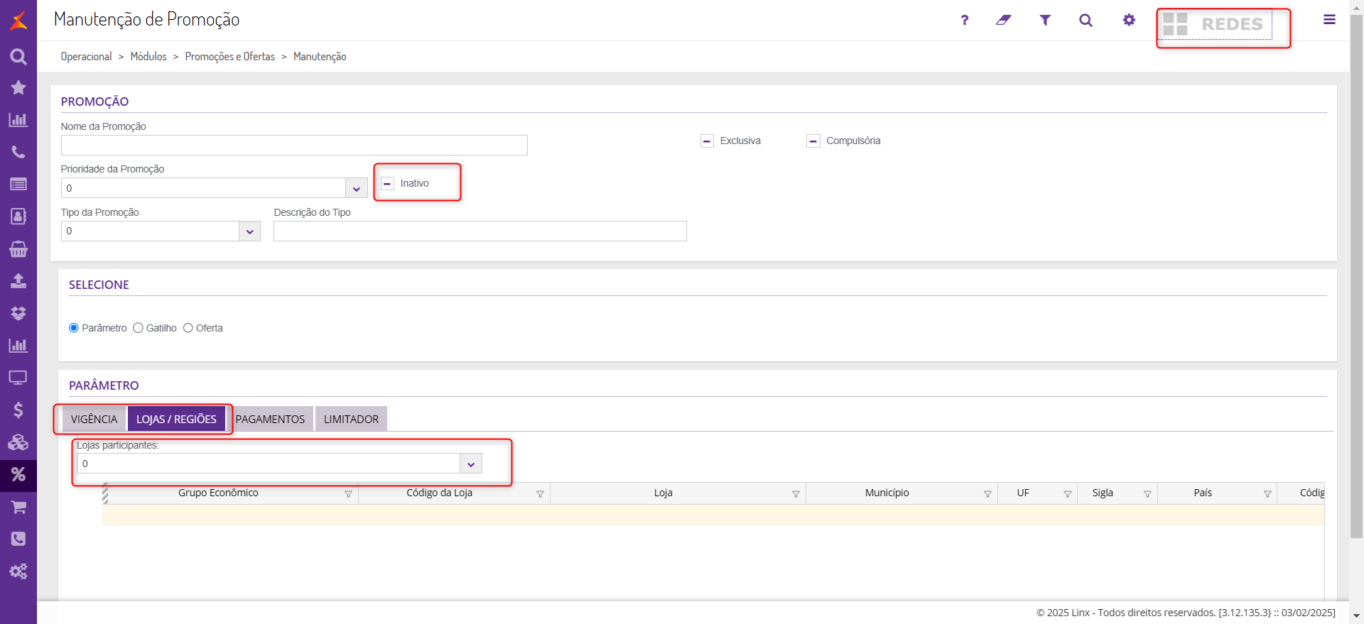 2. Após localizar a promoção, verifique as seguintes informações: Bandeira correspondente, Status da promoção (ativa), Data de vigência, Lojas participantes e vigentes da promoção.