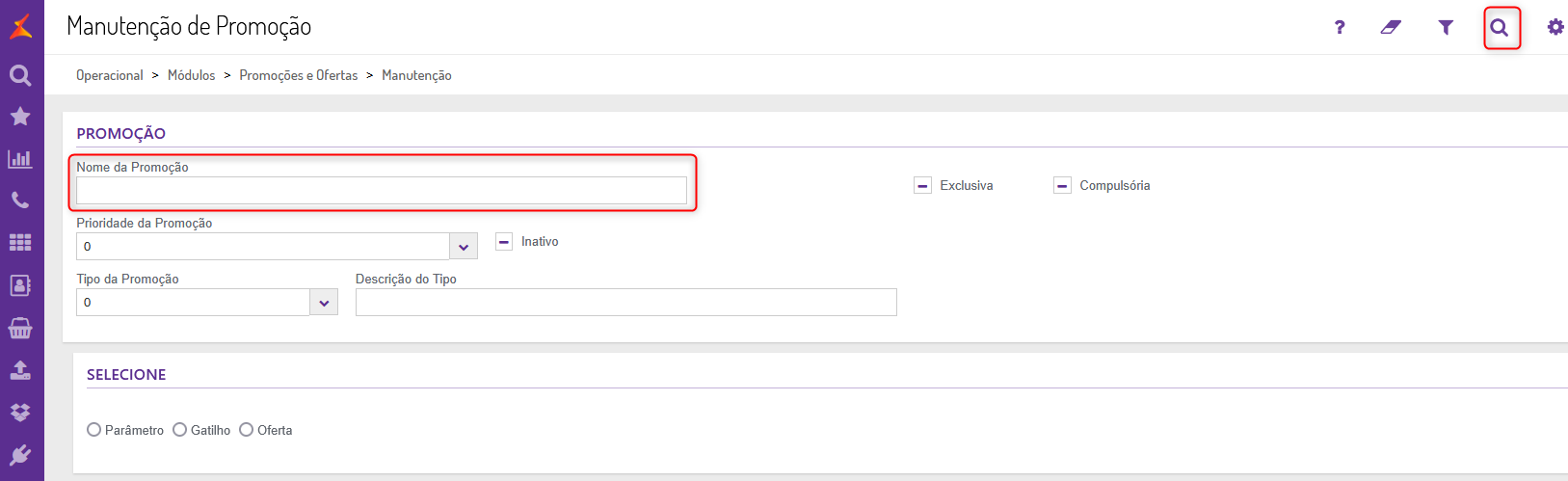 OBS: Caso não tenha o nome exato da promoção, ao buscar os dados da tela sem preencher nenhum dado irá trazer todas as promoções.