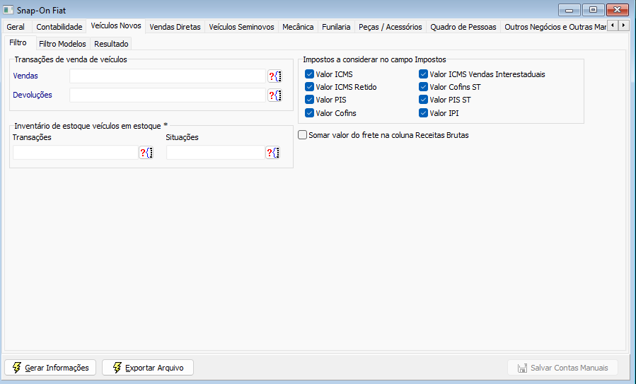 Impostos a considerar no campo Impostos: Permite marcar a opção para selecionar quais impostos serão considerados na geração nas contas de vendas de veículos novos.