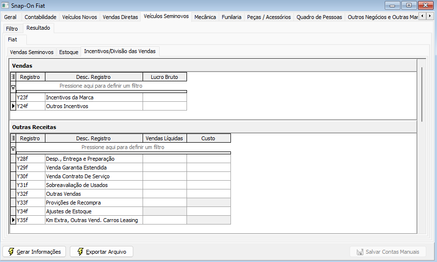 Informações referentes a incentivos recebidos da montadora e veículos usados. Essas informações serão adicionadas aos arquivos gerados neste processo. As informações dessa aba devem ser informadas manualmente.