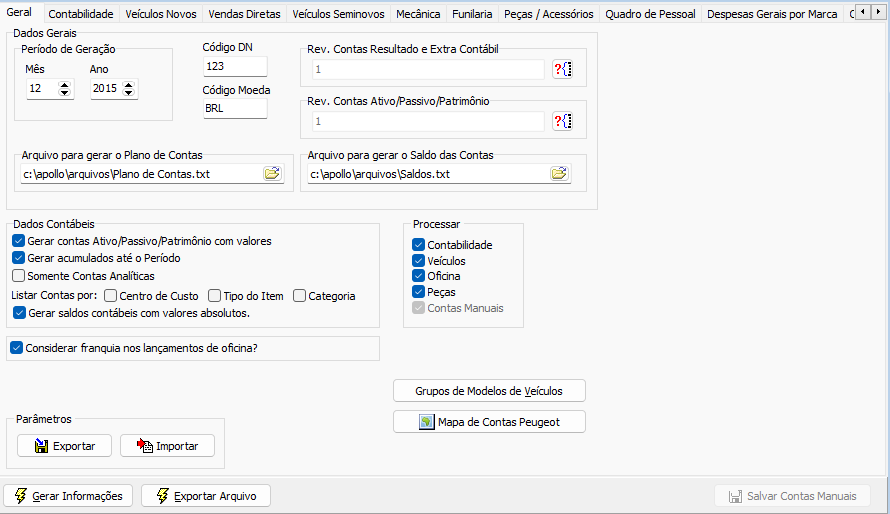 Rev. Contas Resultado e Extra Contábil: Utilizado para filtrar os valores das contas de Resultado e dos valores extra contábeis, como por exemplo, o valor de Venda de veículos;