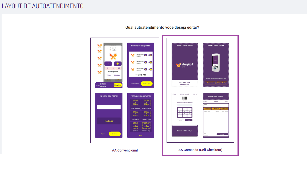 • No Degust One retaguarda vamos acessar (Cadastro> Configuração> Layout de Autoatendimento):
