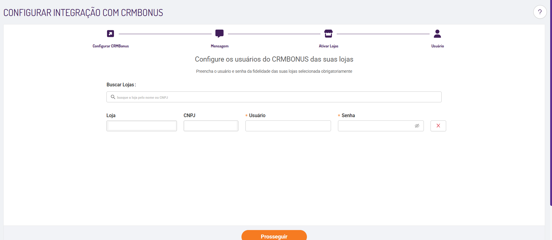 1. Para cada loja habilitada no passo anterior, deve ser adicionado um usuário e senha para loja (fornecido pela CRMBonus).