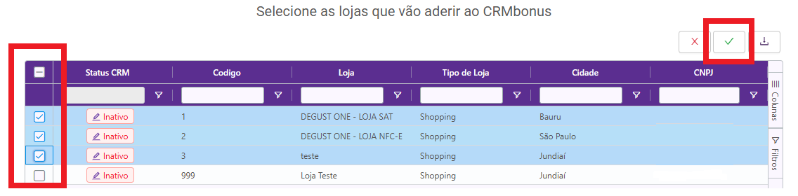 Esta ação pode ser feita em lote, selecionando as lojas desejadas e habilitando a ação em lote.