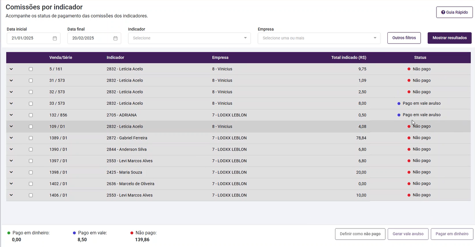 - É possível selecionar/marcar múltiplas linhas, exceto para a opção "Gerar Vale Avulso", pois esta opção pode ser gerada para 1 cadastro, sendo assim, as linhas precisam obrigatoriamente ser do mesmo indicador.