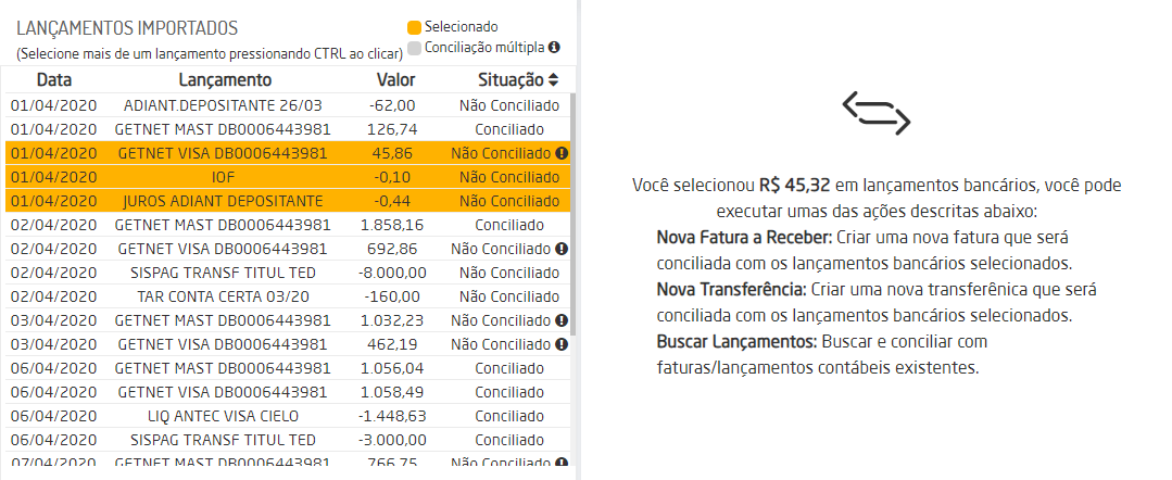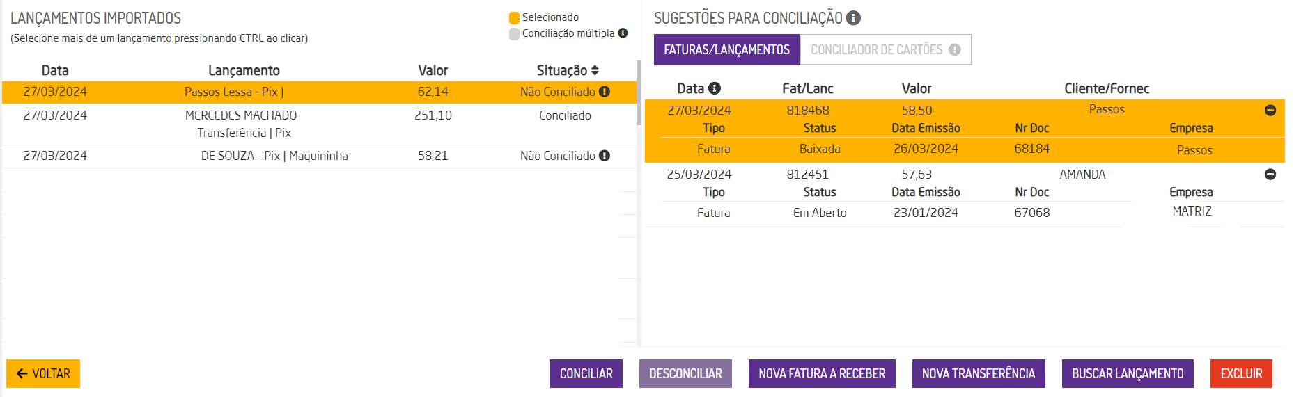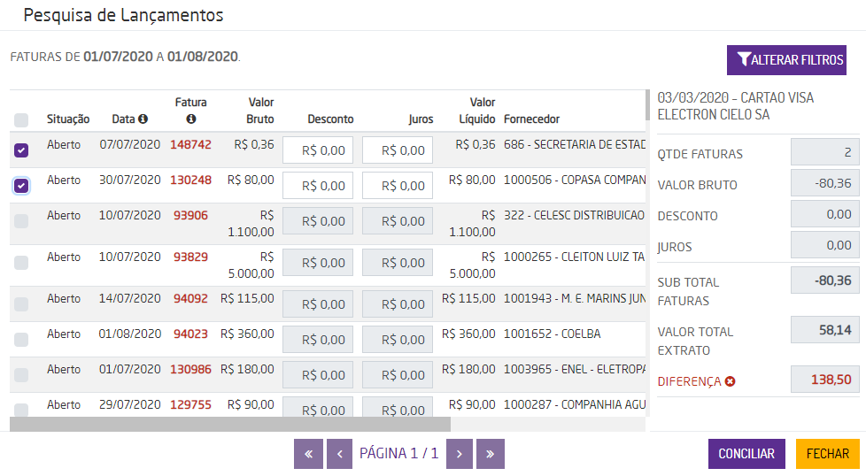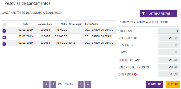 Quando não houver divergência de valores entre o extrato e o subtotal das fatura a conciliação pode ser realizada. Além disso, os dados das faturas conciliadas poderão ser observados no quadro "Lançamentos Conciliados".
