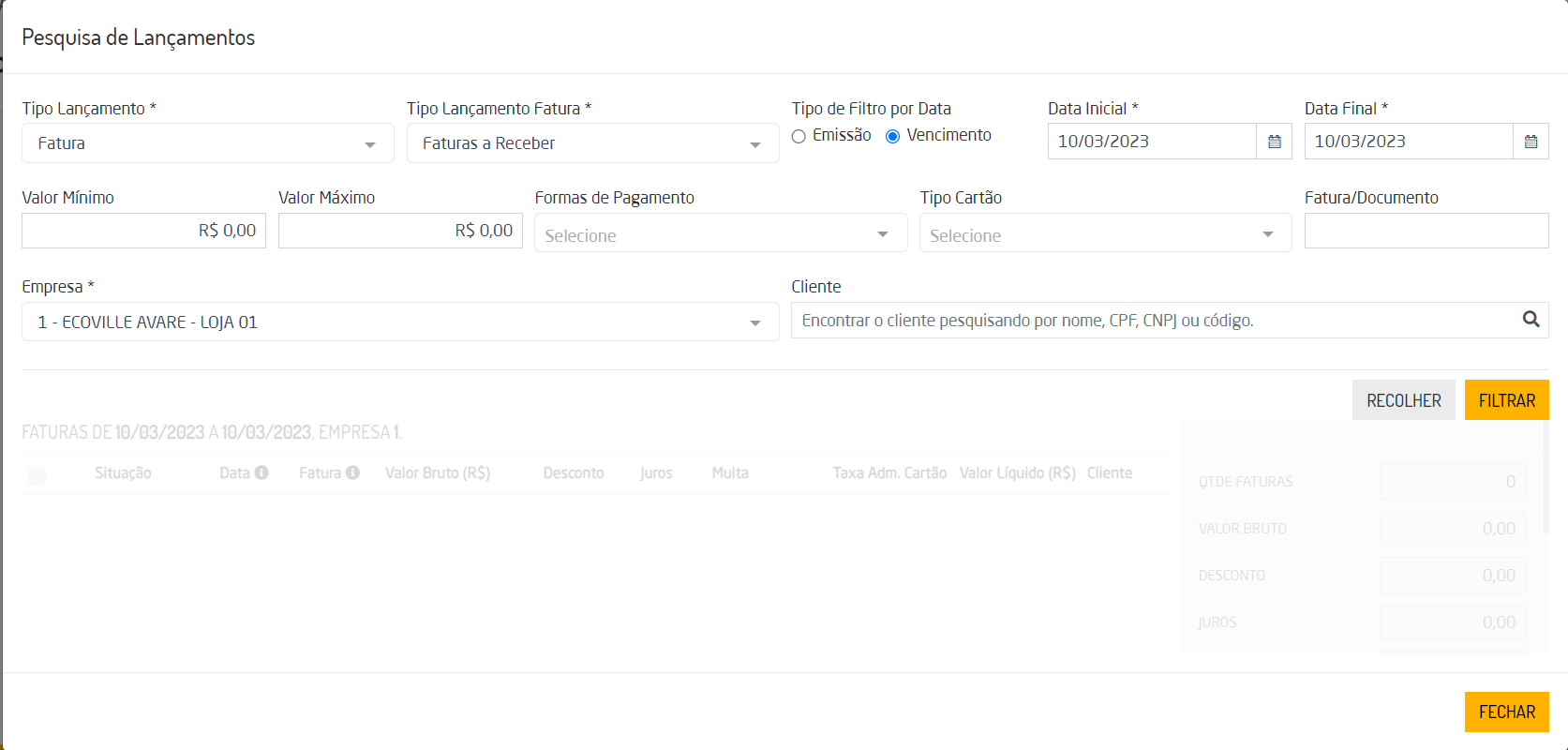 • Juros: quando selecionada a fatura o usuário poderá informar um valor de juros, caso não tenha;